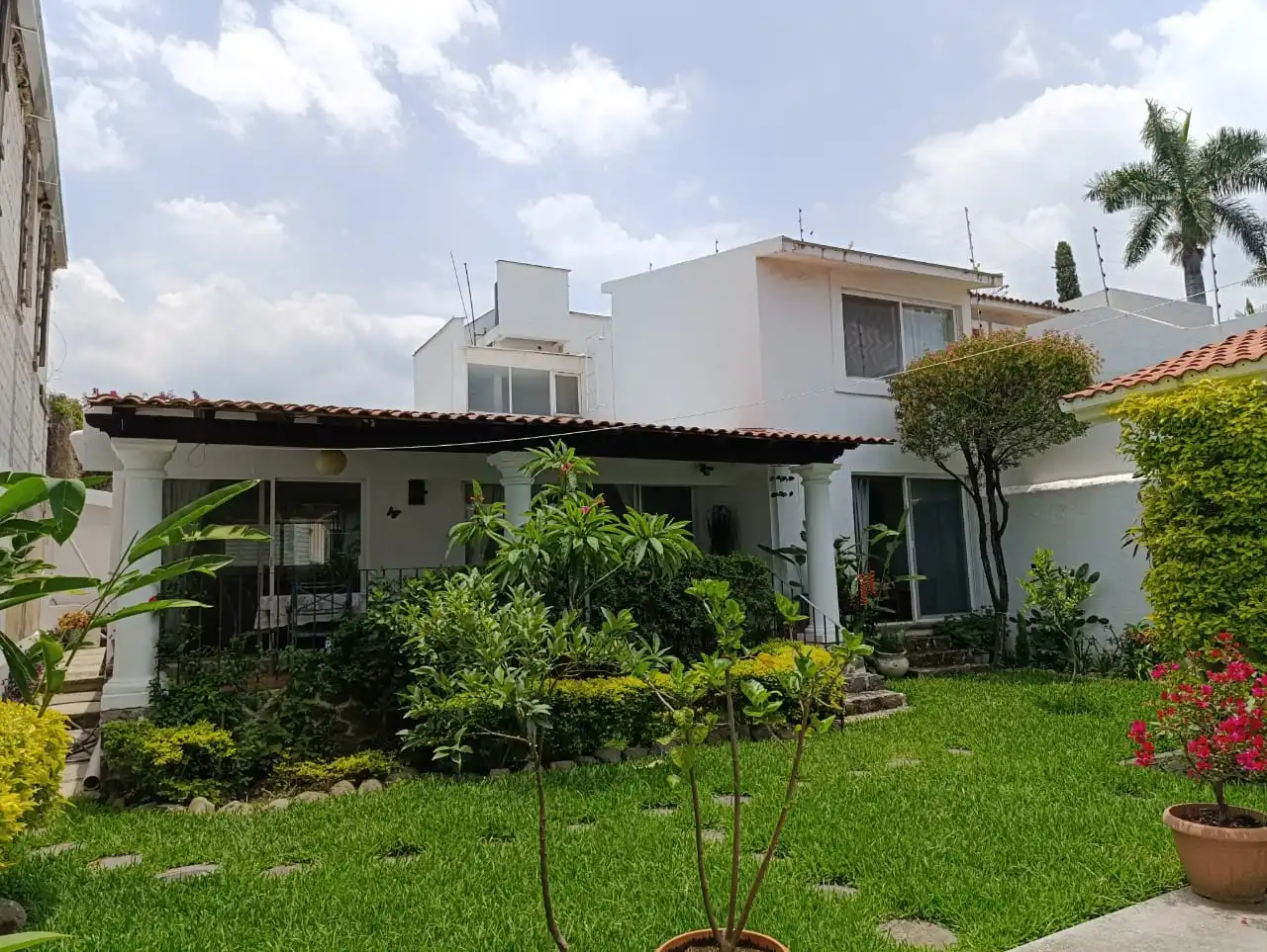 Bonita residencia en la Colonia Jardines de Reforma, en privada con portón eléctrico, 372 m² de terreno, 256 m² de construcción, estilo Cuernavaca moderno, 2 niveles, 3 recámaras, cada una con clóset y baño completo, una recámara en planta alta y 2 recámaras en planta baja, sala de televisión, amplia sala comedor, cocina equipada con barra, área de lavado techada, cuarto de servicio con baño completo, terraza techada grande, además un bungalow completo de 2 niveles con una recámara, balcón, un baño completo, sala comedor con techos doble altura y cocina. Jardín y estacionamiento para 2 autos, hermoso diseño y buenos acabados.