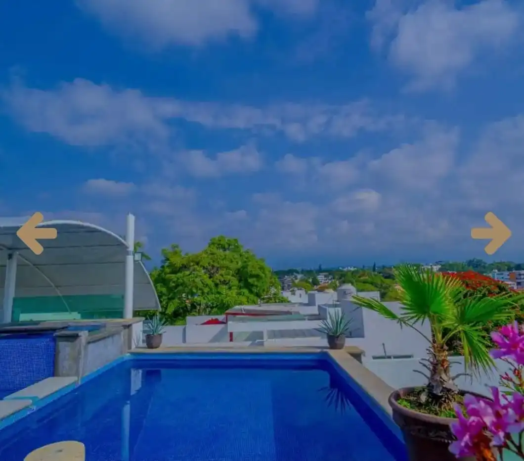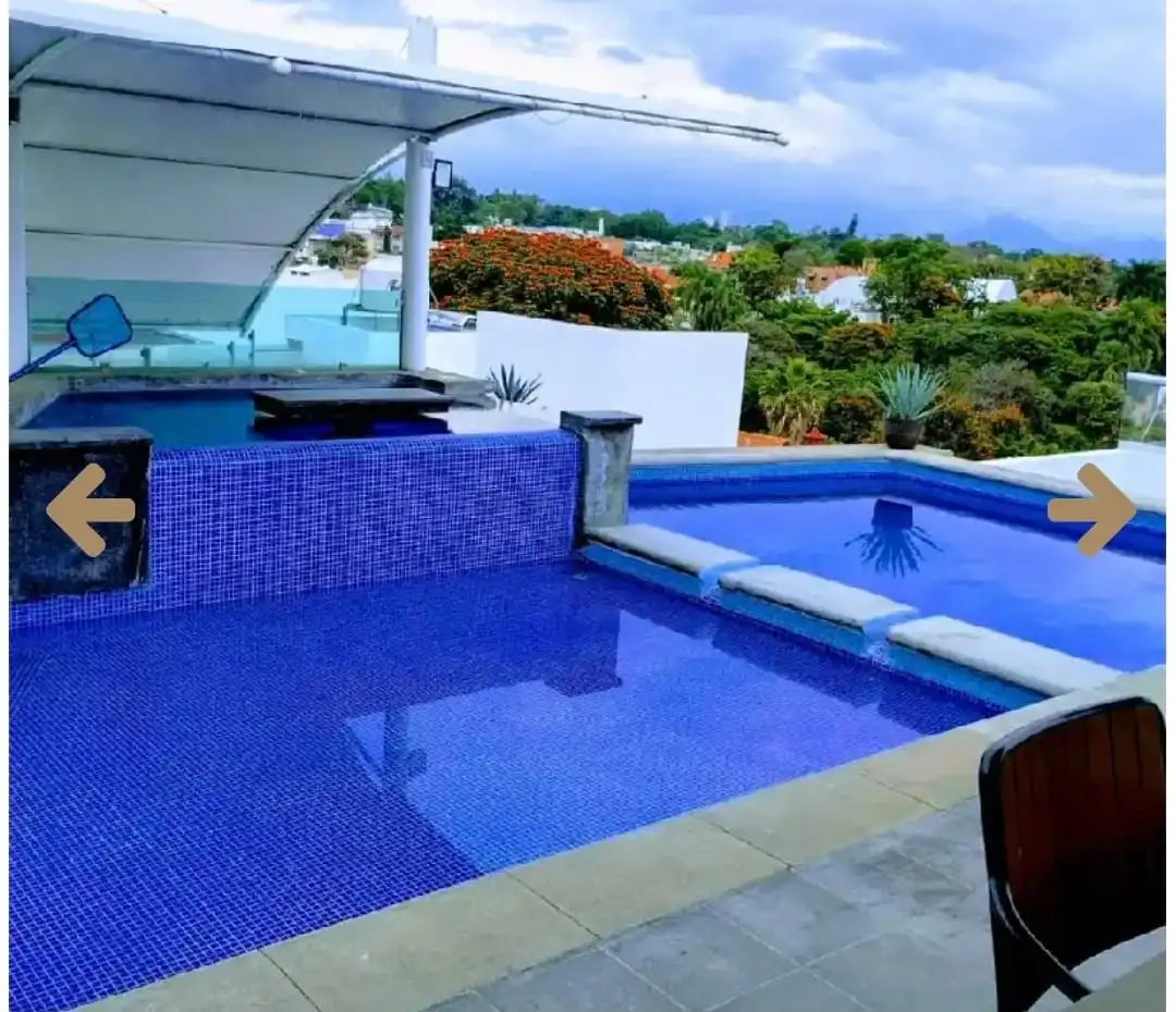 Departamento en plantaen primer piso, en planta baja están los estacionamientos, en privada con jardín, alberca, jacuzzi, arboles, terraza, asador, estanque y cascada. Tiene 2 recamaras, 2 baños, estudio, sala, comedor, cocina equipada, 2 estacionamientos,